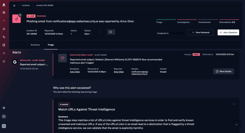 Radiant provides a unified environment for handling alerts, investigations, response actions, and log data, with an emphasis on efficiency, clarity, and analyst control.