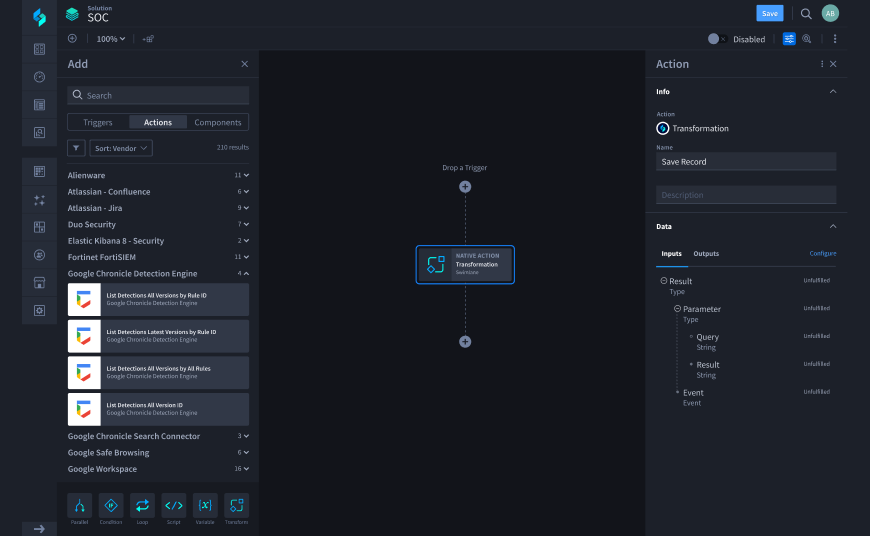 Swimlane is a low-code security automation platform that centralizes and accelerates security operations. It allows teams to build and automate workflows without writing code, making it easier to handle alert triage, case management, and threat response. Swimlane integrates with a range of tools, enabling dynamic data collection, enrichment, and action across the SOC.