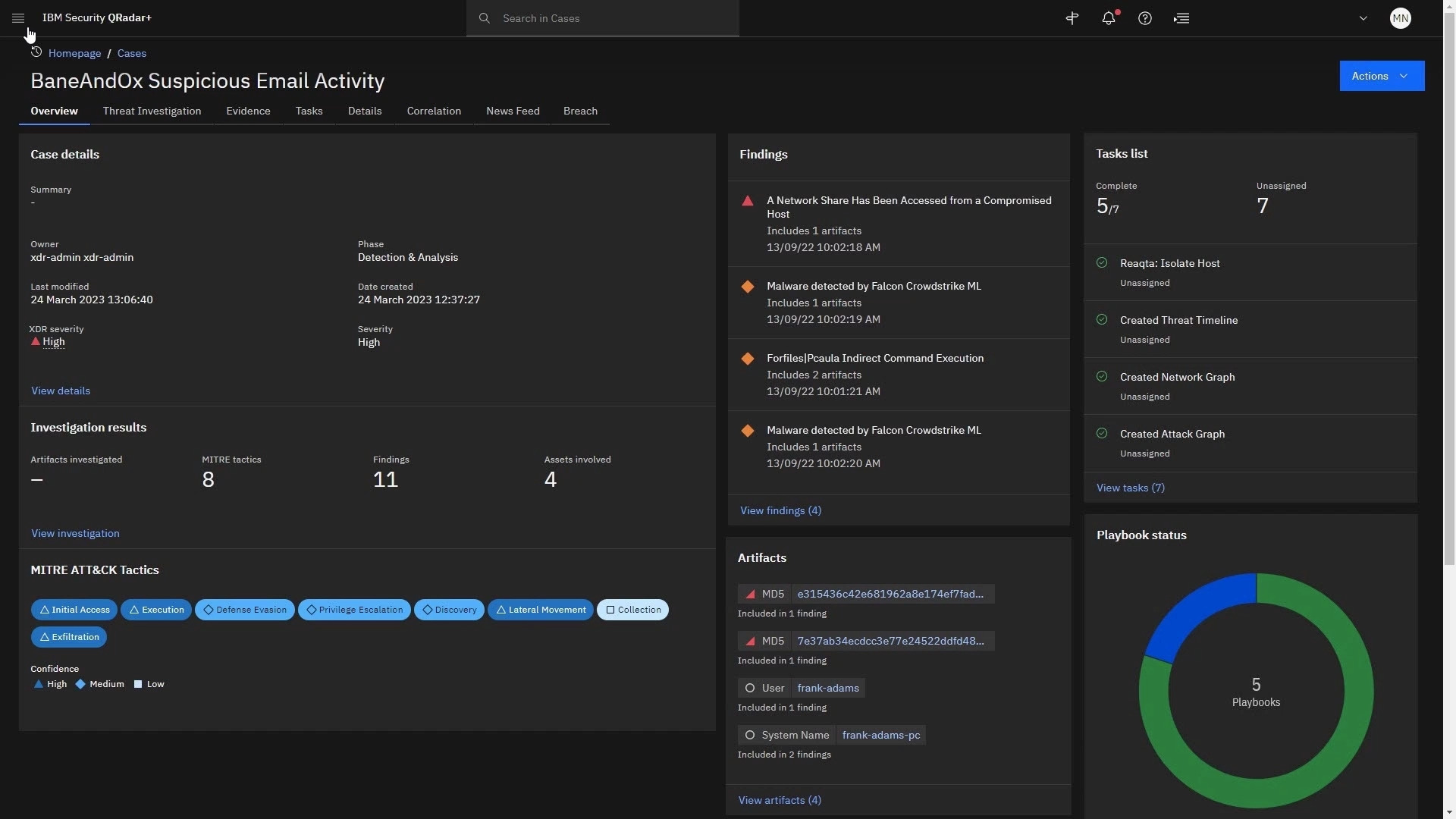 QRadar SOAR helps coordinate incident response by automating tasks, managing cases, and providing guided workflows. It connects with IBM’s broader security ecosystem and third-party tools to orchestrate response actions across the environment. The platform includes dynamic playbooks, collaboration, and post-incident analysis. It also supports regulatory requirements through audit trails and reporting.